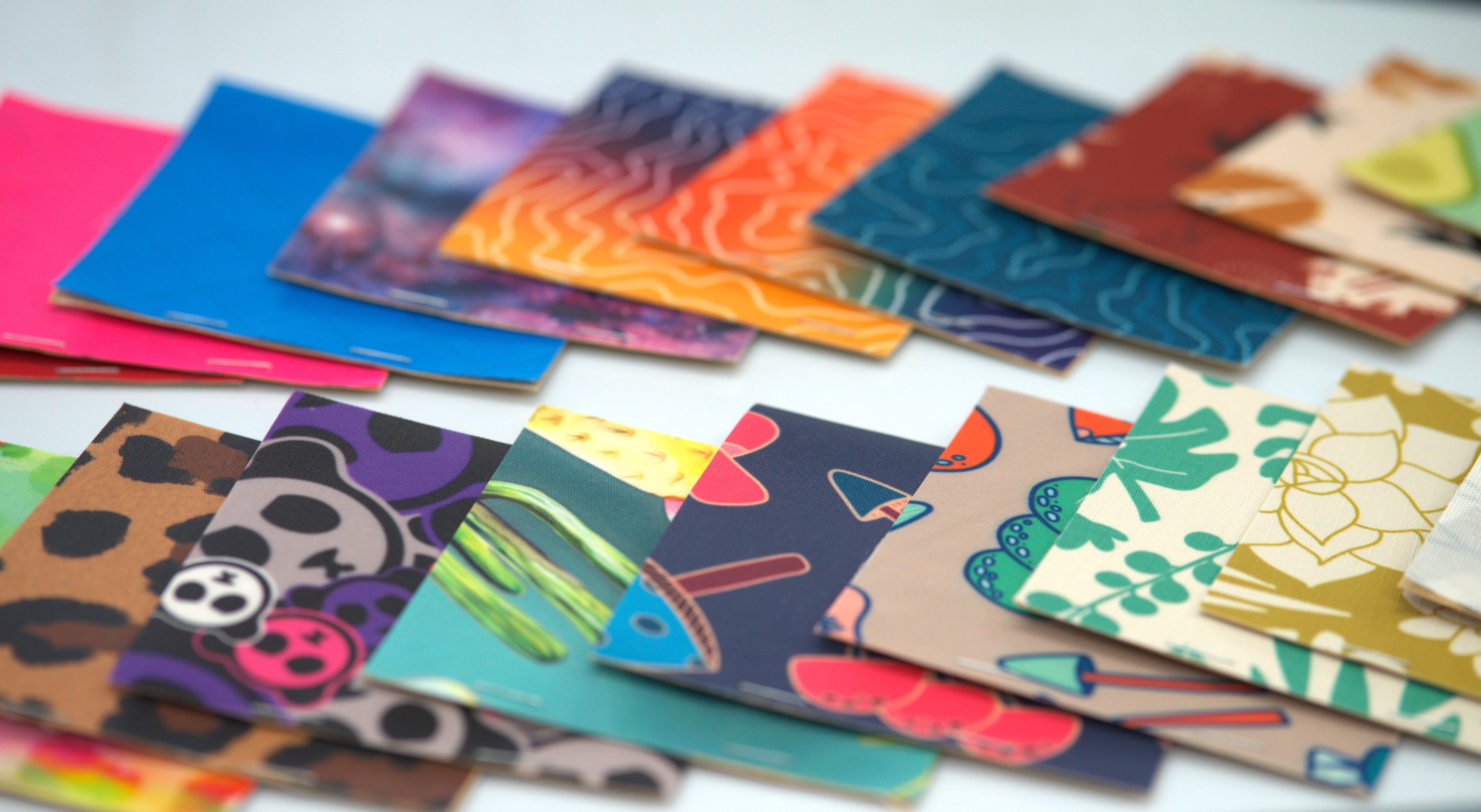 We can only print onto our EPL150 fabric. Dye sublimation can't lighten fabrics, it only darkens. So we have to start with white and print the entire design including any background color. We had EPL150 custom-made for this purpose. We cannot print a design on top of our solid color fabrics or onto Ultra fabrics.